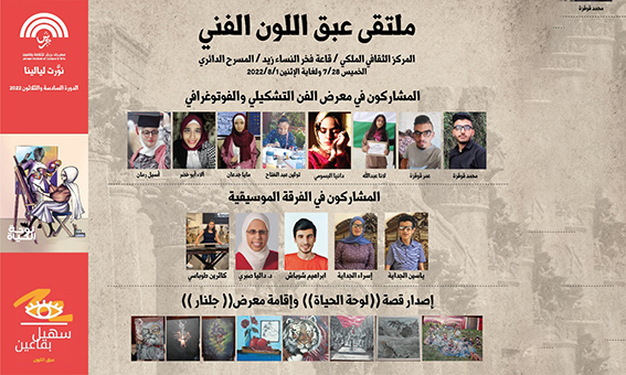 يشارك في معرض الفن التشكيلي والفوتوغرافي والحفل الموسيقي الذي يتواصل حتى الاثنين 1/ 8 عدد من الفنانين من الأشخاص ذوي الاحتياجات الخاصة، من ضعاف البصر وذوي الإعاقة البصرية والمكفوفين، وهم: تولين، مايا جدعان، ألاء أبو خضر، أسيل رمان، محمد قوقزة، عمر قوقزة، لانا عبدالله، دانيا، ياسين الجداية، إسراء الجداية، إبراهيم شوباش، د. داليا صبري وكاثرين طوباسي، الذين يقدمون مجموعة من أعمالهم التي أنجزوها بإشراف صاحب الفكرة والمبادرة الفنان سهيل بقاعين في محترف الملتقى.