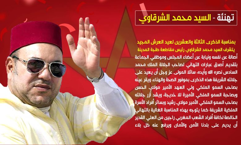بمناسبة الذكرى الثالثة والعشرين لعيد العرش المجيد يتشرف السيد محمد الشرقاوي رئيس مقاطعة طنجة المدينة أصالة عن نفسه ونيابة عن أعضاء المجلس وموظفي الجماعة بتقديم أصدق عبارات التهاني لصاحب الجلالة الملك محمد السادس نصره الله وأيده، سائلا المولى عز وجل أن يعيد على جلالته الشريفة هذه الذكرى بموفور الصحة والهناء، ويقر عينه بصاحب السمو الملكي ولي العهد الأمير مولاي الحسن وبصاحبة السمو الملكي الأميرة للا خديجة، ويشد أزر جلالته بصاحب السمو الملكي الأمير مولاي رشيد وبسائر أفراد الأسرة الملكية الشريفة كما يتوجه بهذه المناسبة الغالية بالتهاني الخالصة لكافة أفراد الشعب المغربي راجين من العلي القدير أن يديم على بلدنا الأمن والأمان ويرفع عنه كل بلاء